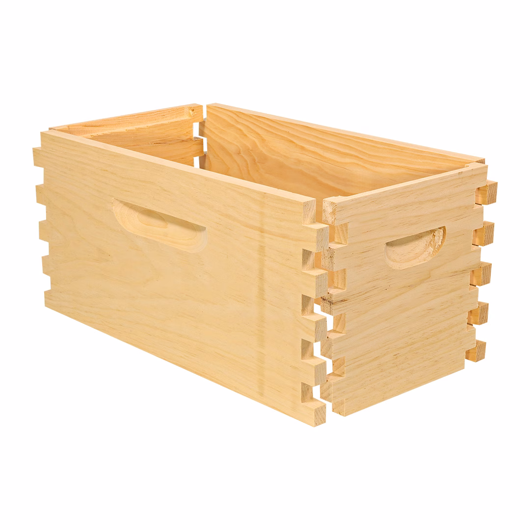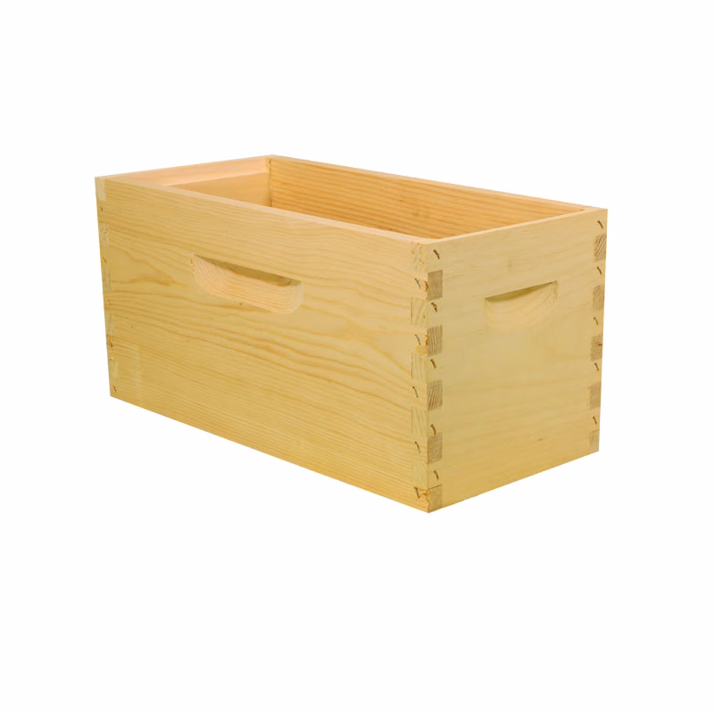 These 5-frame deep nuc bodies are the standard 9 5/8″ in depth. They feature a full top joint which greatly reduces breakage, and a 5/8″ routered frame rest. Handholds with deep, profiled uppercuts are easy to grip and allow water to run off the bottom.