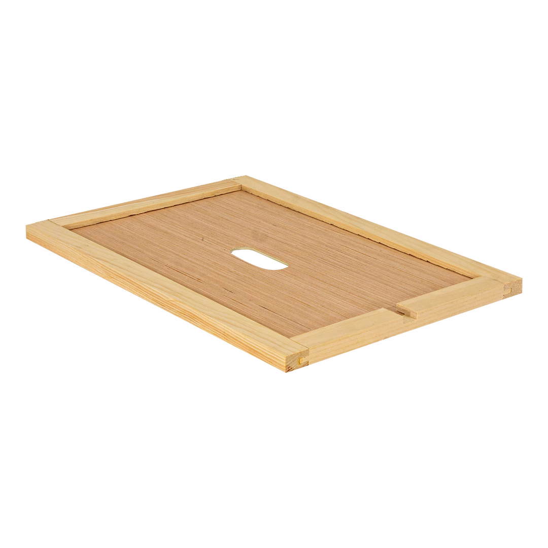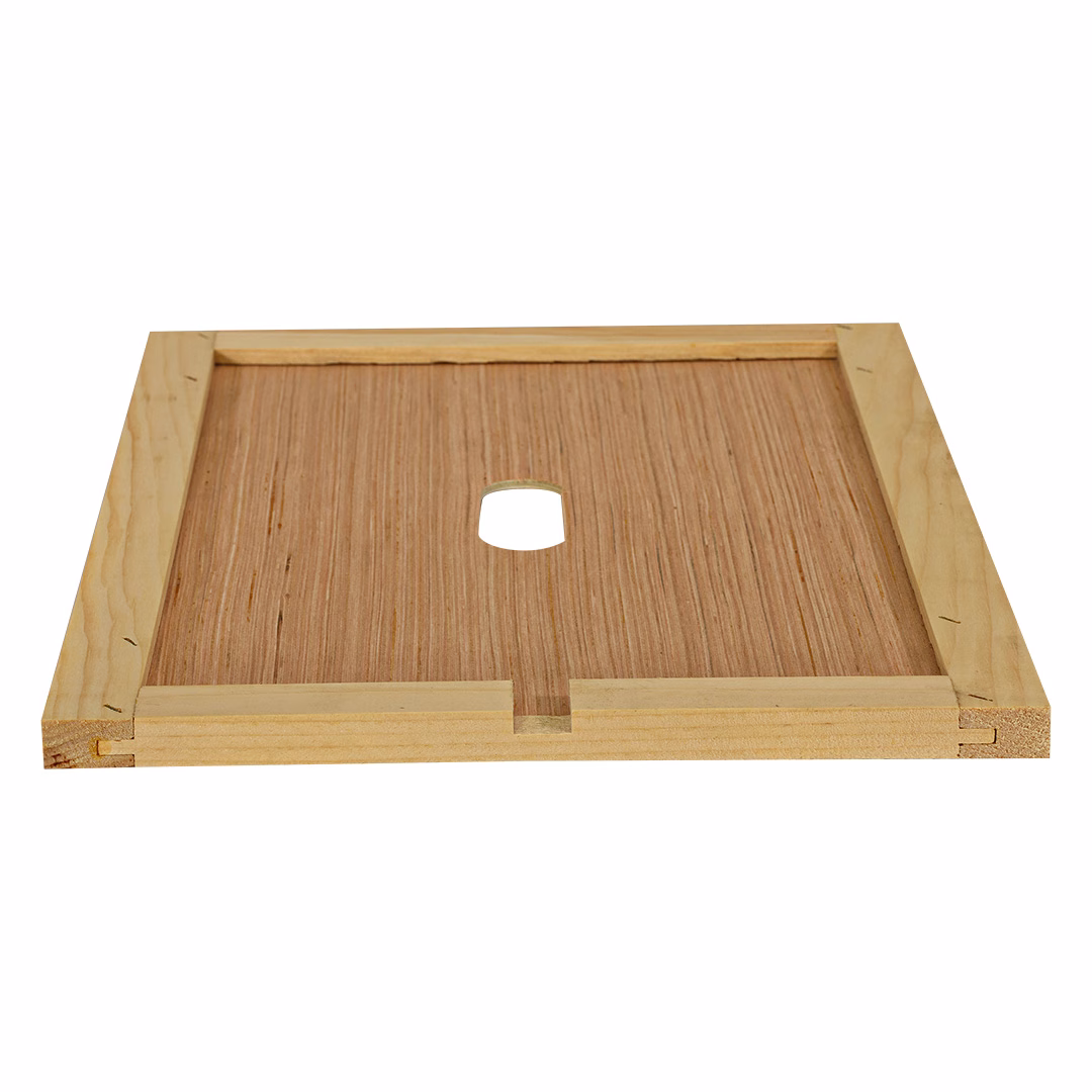 Standard assembled 8-frame raised-panel style with about 1/8″ recess on the one side and 3/8″ on the other side. Corners are tenoned and plywood is 1/4″ luann with the standard cutout in the center for a bee escape. Corners are glued when we assemble.