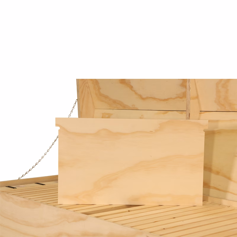 A double inner cover, with one hole for each side of the hive, is included. The sturdy lid is connected by hinges and a chain to allow it to stay securely connected to the hive.