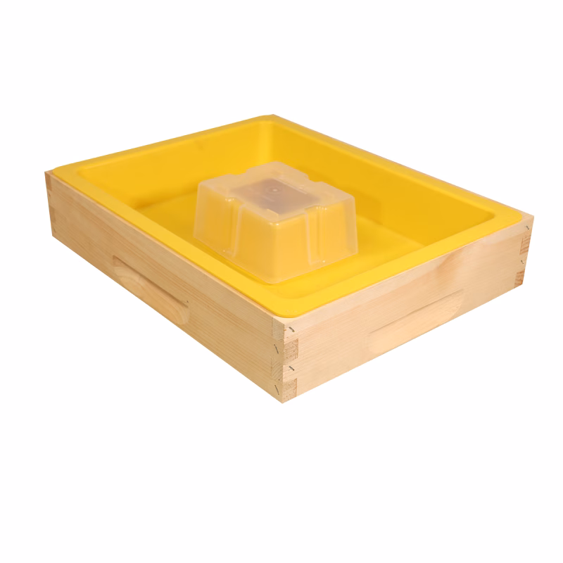 A plastic insert-style top feeder with center bee access to syrup. Designed to minimize drowning and yet feed lots of syrup with easy beekeeper access for refilling. A 4″ wooden rim supports the feeder and also provides space below for treatments and pollen substitute. Holds two gallons of syrup.
