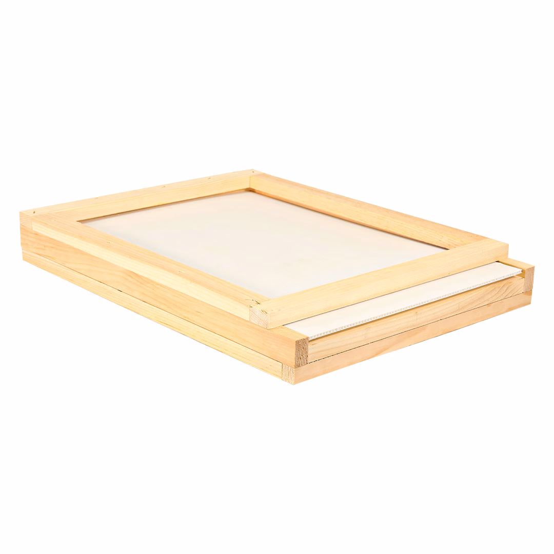 Designed to be versatile, sturdy, and easy to use, this bottom board stands alone. It needs no other bottom boards or add-ons to function. A 1/8″ mesh screen covers the entire floor allowing for greatest ventilation and mite drop possible. 3/4″ strips around three sides provide the entrance. A white plastic corrugated tray slips in the back on a track below the screen to monitor mite drop. By using 1 3/8″ stock for two interlocking frames we have achieved a very strong, durable construction. Since it is not necessary to have a mite tray for every bottom board, they must be ordered separately.