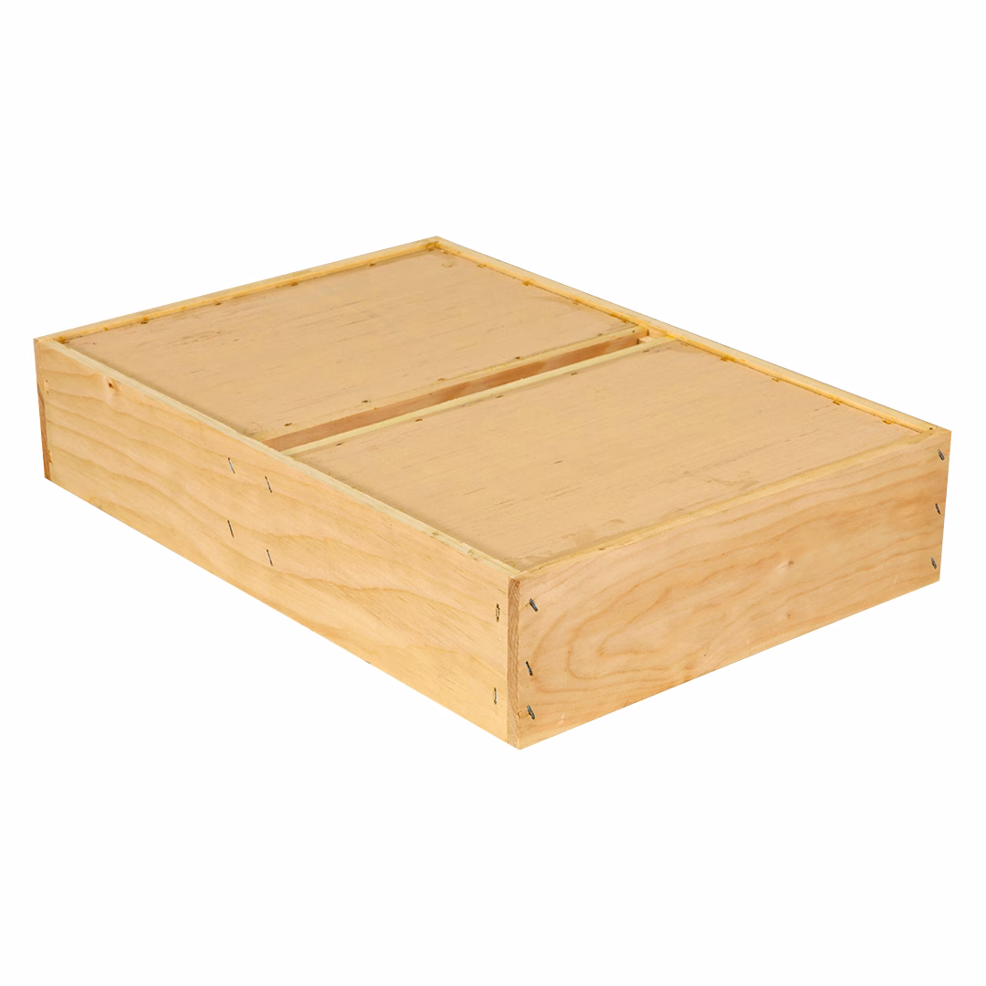 With each compartment holding one gallon, this 8-frame, two compartment feeder sits on top of the hive boxes, just under the inner cover. Bees access the feeding area through an open slot that runs cross-ways in the middle. After syrup is poured into the compartments, pine slatted floats (sold separately) can be placed on top of the syrup, preventing drowning. The bottom is recessed 1/8″ to minimize rocking on burr comb left on the top bars of the box below it. When we assemble, seems are caulked to ensure that it is leak-proof.