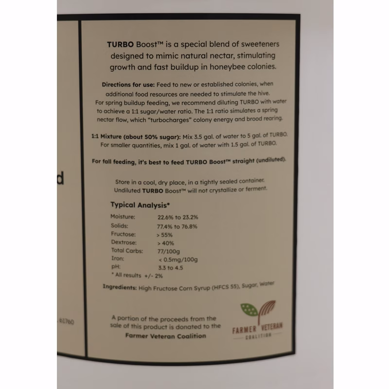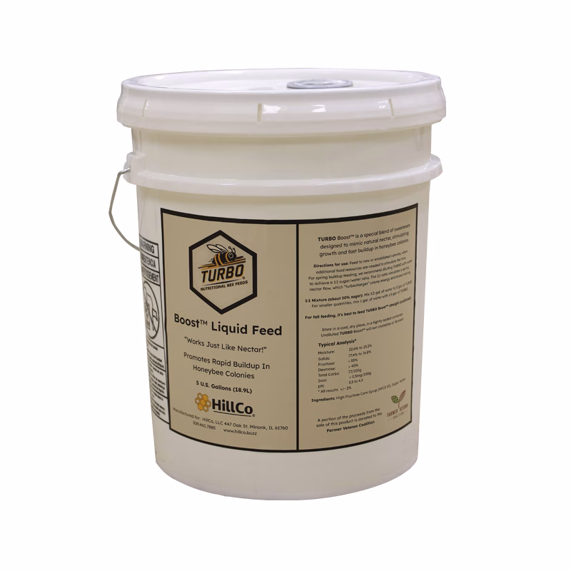 Leave behind the hassle of mixing your own syrup and buy TURBO Liquid Feed by the 5 gallon bucket! With a mix of High Fructose Corn Syrup (HFCS 55), Sugar and Water, TURBO will give your colony’s population a boost, just like nectar.